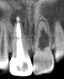 隣在歯の根尖性歯周炎の可能性 根尖性歯周炎は、歯髄組織が壊死を起こしているか、過去に根管治療を施行された「失活歯」にしか発症しません。今回の症例では、右上顎側切歯および左上顎中切歯にEPT(電気歯髄診)で生活反応を示したため、消去法で原因歯は過去に根管治療を施行されている「右上顎中切歯」のみとなります。