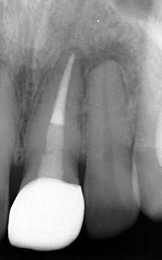 しかし実際に診査診断をしてみると、左上顎側切歯はEPT陽性の「生活歯」でした。つまり、透過像の原因はこの歯ではなかったのです。結果的に左上顎中切歯の再精密根管治療を行うことで透過像の改善を認めました。もし側切歯を抜歯していたら……と思うと、患者様にセカンドオピニオンの発想がなければ大変悲しい結末となっておりました。