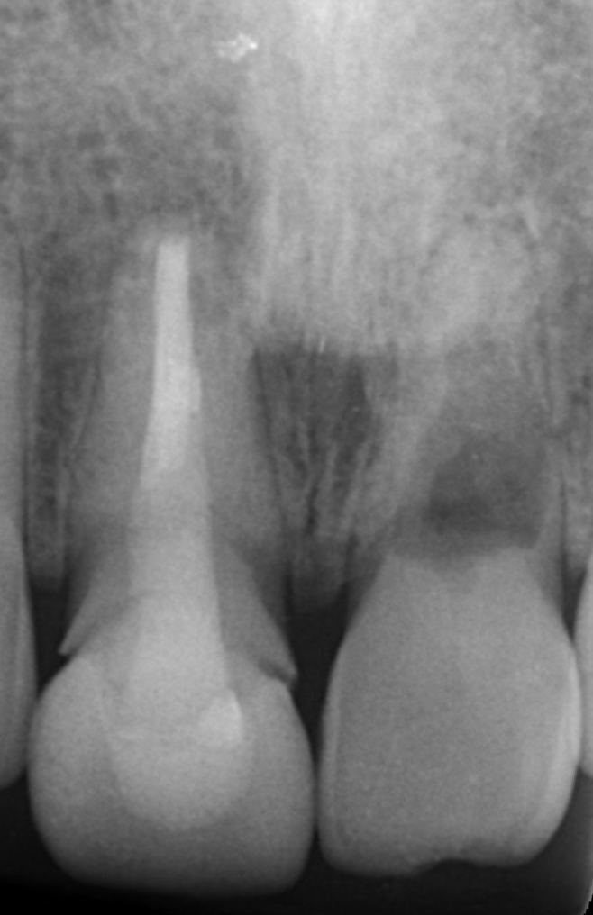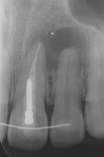 ここで、正確な診断がいかに大切かを示す別の症例を供覧いたします。 レントゲン上では左上顎側切歯の根尖部に大きな透過像を認め、前医では「抜歯してインプラント」と言われていたケースです。