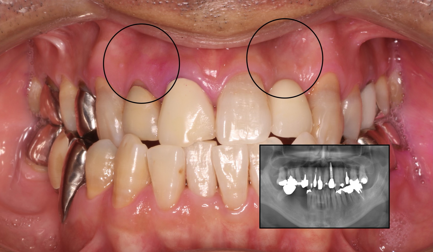 こちらは患者様のご希望でCTGを施行しなかった症例です。機能上は全く問題なく4年経過していますが天然歯である右側に比べるとインプラントである左側は歯肉が痩せているのが分かります。