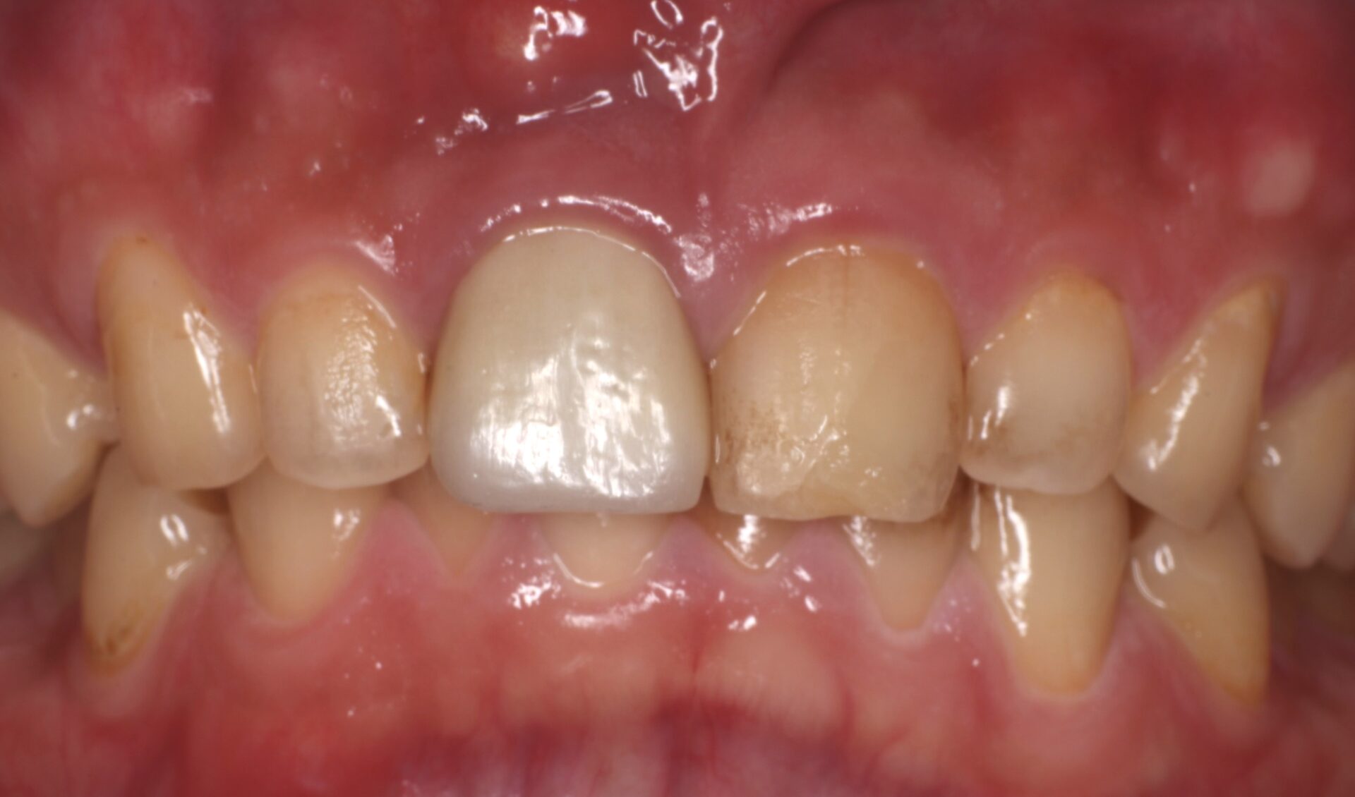 左上顎中切歯:抜歯即時埋入・即時負荷によるインプラント埋入、CTG(結合組織移植術)、セラミッククラウンによる上部構造