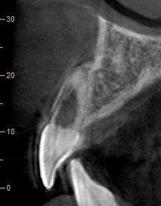 ここで、正確な診断がいかに大切かを示す別の症例を供覧いたします。 レントゲン上では左上顎側切歯の根尖部に大きな透過像を認め、前医では「抜歯してインプラント」と言われていたケースです。